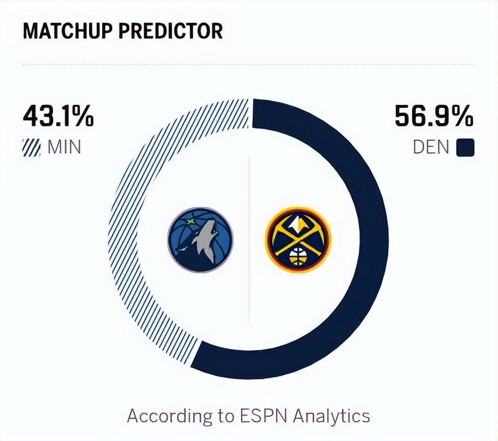 整体来看,掘金的整体实力与阵容稳定性更胜一筹,内外线双核发挥成熟可靠,戈贝尔难以有效限制约基奇的组织与内线进攻,角色球员的发挥也更具持续性。赛前,ESPN预测本场比赛结果,掘金胜率56.9%,森林狼胜率43.1%,显然他们更看好掘金主场击败森林狼。